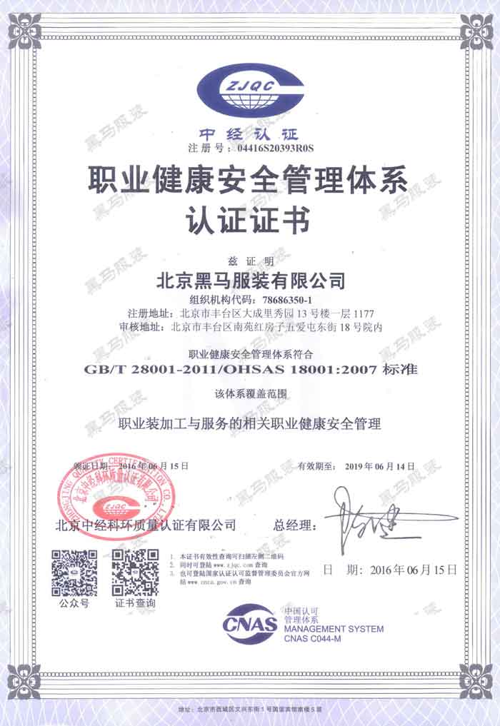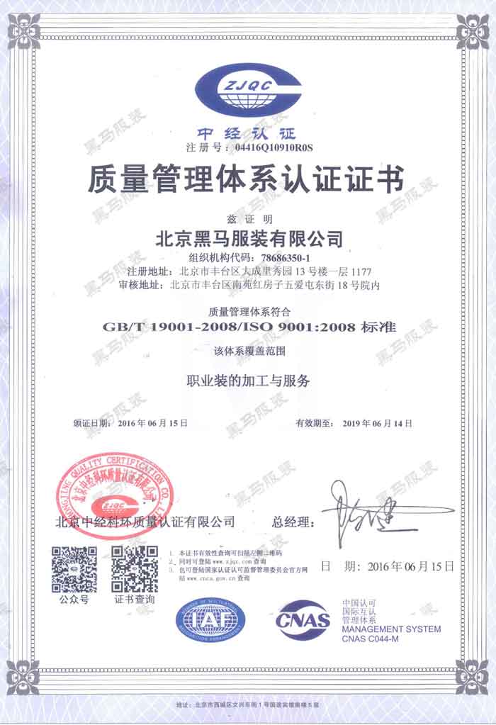 公司先后通過(guò)ISO9001國(guó)際質(zhì)量管理體系認(rèn)證、ISO14001國(guó)際環(huán)境管理體系認(rèn)證和GB/T28001國(guó)際職業(yè)健康安全認(rèn)證,是北京為數(shù)不多的全部通過(guò)三標(biāo)認(rèn)證的服裝生產(chǎn)企業(yè)。