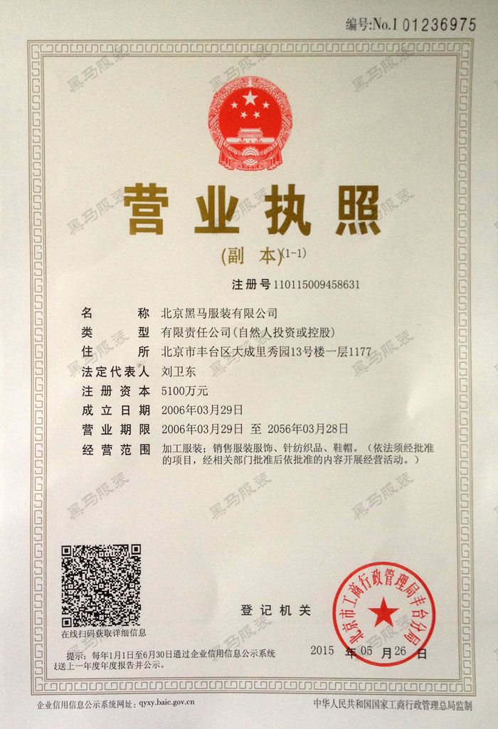 北京黑馬服裝有限公司,注冊(cè)商標(biāo)"黑馬服裝",公司成立于2006年3月,是集設(shè)計(jì)、生產(chǎn)、銷售、服務(wù)于一體的中高檔工作服定制品牌,總部位于北京豐臺(tái)區(qū),員工逾380人,占地面積2.3萬(wàn)平方,工作服月產(chǎn)量高達(dá)50萬(wàn)套、西服20萬(wàn)套、襯衫15萬(wàn)件,連續(xù)八年給長(zhǎng)城汽車、中糧供應(yīng)高檔質(zhì)量工作服,用戶超過(guò)500萬(wàn)。